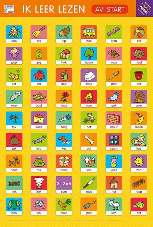 Leren lezen wordt nog leuker met deze kleurrijke poster! Er staan een heleboel eenvoudige woordjes op die je kind al snel zelfstandig zal kunnen lezen. Alle woorden bestaan namelijk slechts uit één lettergreep en zijn klankzuiver. Door het aantrekkelijke ontwerp is deze poster niet alleen heel leerzaam, maar tegelijkertijd een mooie eyecatcher voor de kinderkamer. Op AVI-niveau START Voor kinderen vanaf 5 jaar