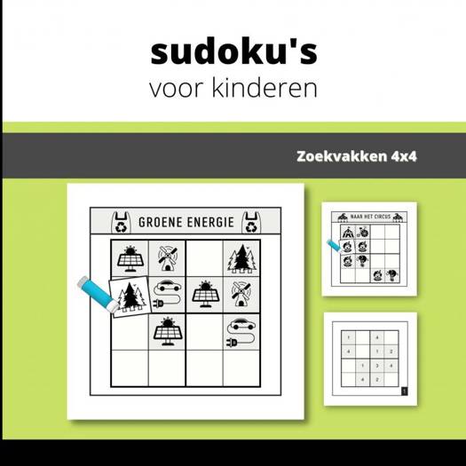 Leuke plaatjes sudoku's waarbij je kind de plaatjes dient uit knippen en op de sudoku dient te plakken en aldus kan leren sudoku's in te vullen. Met thema's: het circus, groene energie, naar de film,... Inclusief sudoku's met cijfers 1 tot 4.