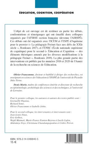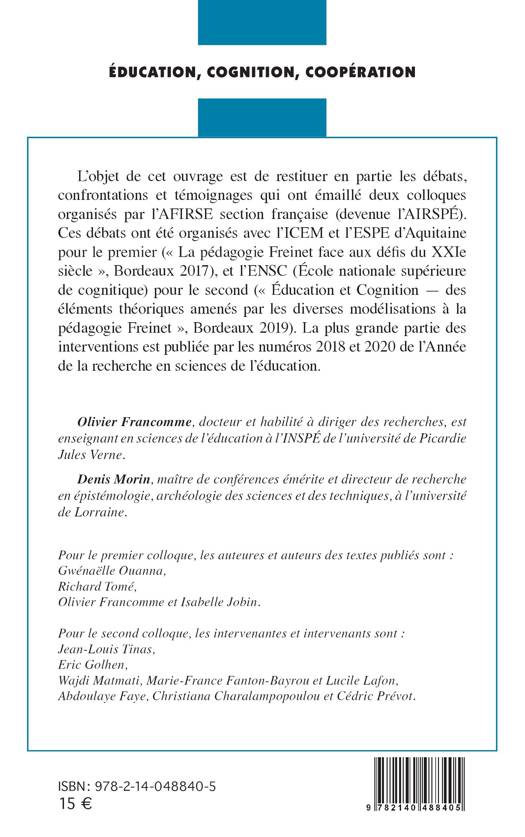 L'objet de cet ouvrage est de restituer en partie les débats, confrontations et témoignages qui ont émaillé deux colloques organisés par l'AFIRSE section française (devenue l'AIRSPÉ). Ces débats ont été organisés avec l'ICEM et l'ESPE d'Aquitaine pour le premier ( La pédagogie Freinet face aux défis du XXIe siècle, Bordeaux 2017), et l'ENSC (École nationale supérieure de cognitique) pour le second ( Éducation et Cognition - des éléments théoriques amenés par les diverses modélisations à la pédagogie Freinet, Bordeaux 2019). La plus grande partie des interventions est publiée par les numéros 2018 et 2020 de l'Année de la recherche en sciences de l'éducation.