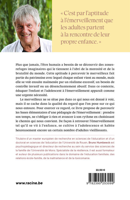 Plus que jamais, l'être humain a besoin de se découvrir des zones-refuges imaginaires qui le tiennent à l'abri de la morosité et de la brutalité du monde. Cette aptitude à percevoir le merveilleux fait partie du patrimoine avec lequel chaque enfant vient au monde, mais elle se voit ensuite malmenée par un réalisme excessif, un besoin de contrôle invasif ou un désenchantement abusif. Dans ce contexte, éduquer l'enfant et l'adolescent à l'émerveillement apparaît comme une urgente nécessité. Le merveilleux ne se situe pas dans ce qui nous est donné à voir mais il se cache dans la qualité du regard que l'on pose sur ce qui nous entoure. Pour exercer ce regard, ce livre propose de parcourir les bases élémentaires d'une pédagogie de l'émerveillement : prendre son temps, ne s'obliger à rien et avancer à son rythme en choisissant le chemin qui nous convient. De façon à retrouver l'émerveillement tel qu'il se vit à l'enfance, se cultive à l'adolescence et habite encore un certain nombre d'adultes vieillissants. « C'est par l'aptitude à l'émerveillement que les adultes partent à la rencontre de leur propre enfance. »