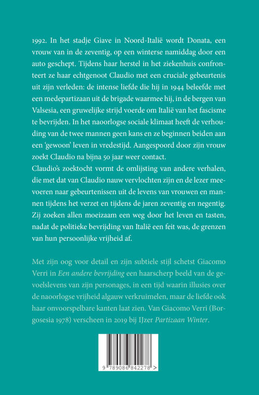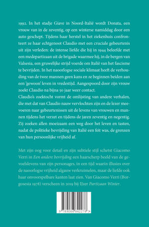 1992. In het stadje Giave in Noord-Italië wordt Donata, een vrouw van in de zeventig, op een winterse namiddag door een auto geschept. Tijdens haar herstel in het ziekenhuis confronteert ze haar echtgenoot Claudio met een cruciale gebeurtenis uit zijn verleden: de intense liefde die hij in 1944 beleefde met een medepartizaan uit de brigade waarmee hij, in de bergen van Valsesia, een gruwelijke strijd voerde om Italië van het fascisme te bevrijden. In het naoorlogse sociale klimaat heeft de verhouding van de twee mannen geen kans en ze beginnen beiden aan een ‘gewoon’ leven in vredestijd. Aangespoord door zijn vrouw zoekt Claudio na bijna 50 jaar weer contact.Claudio’s zoektocht vormt de omlijsting van andere verhalen, die met dat van Claudio nauw vervlochten zijn en de lezer meevoeren naar gebeurtenissen uit de levens van vrouwen en mannen tijdens het verzet en tijdens de jaren zeventig en negentig. Zij zoeken allen moeizaam een weg door het leven en tasten, nadat de politieke bevrijding van Italië een feit was, de grenzen van hun persoonlijke vrijheid af. Met zijn oog voor detail en zijn subtiele stijl schetst Giacomo Verri in Een andere bevrijding een haarscherp beeld van de gevoelslevens van zijn personages, in een tijd waarin illusies over de naoorlogse vrijheid algauw verkruimelen, maar de liefde ook haar onvoorspelbare kanten laat zien. Van Giacomo Verri (Borgosesia 1978) verscheen in 2019 bij IJzer Partizaan Winter.