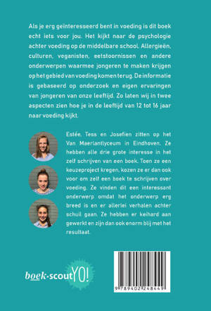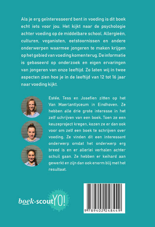 Als je erg geïnteresseerd bent in voeding is dit boek echt iets voor jou. Het kijkt naar de psychologie achter voeding op de middelbare school. Allergieën, culturen, veganisten, eetstoornissen en andere onderwerpen waarmee jongeren te maken krijgen op het gebied van voeding komen terug. De informatie is gebaseerd op onderzoek en eigen ervaringen van jongeren van onze leeftijd. Zo laten wij in twee aspecten zien hoe je in de leeftijd van 12 tot 16 jaar naar voeding kijkt.