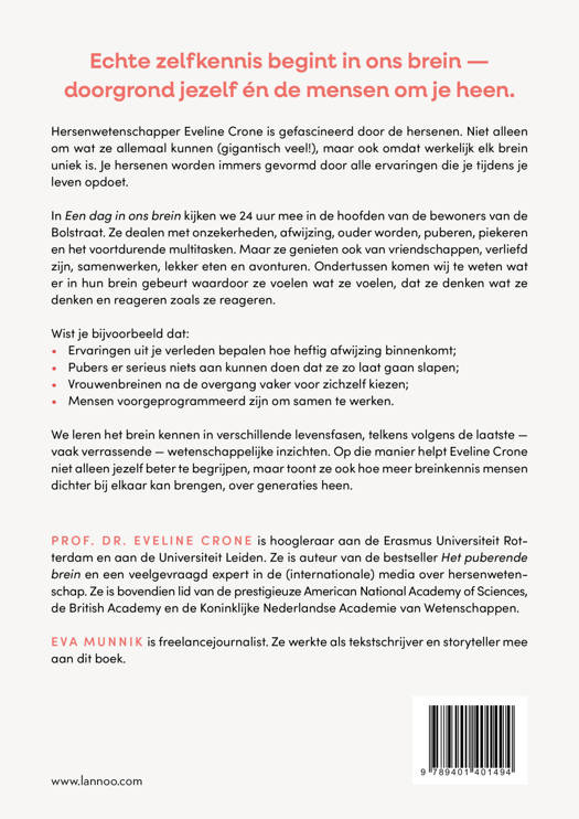 Hersenwetenschapper Eveline Crone is gefascineerd door de hersenen. Niet alleen om wat ze allemaal kunnen (gigantisch veel!), maar ook omdat werkelijk elk brein uniek is. Je hersenen worden immers gevormd door alle ervaringen die je tijdens je leven opdoet. In Een dag in ons brein kijken we 24 uur mee in de hoofden van de bewoners van de Bolstraat. Ze dealen met onzekerheden, afwijzing, ouder worden, puberen, piekeren en het voortdurende multitasken. Maar ze genieten ook van vriendschappen, verliefd zijn, samenwerken, lekker eten en avonturen. Ondertussen komen wij te weten wat er in hun brein gebeurt waardoor ze voelen wat ze voelen, dat ze denken wat ze denken en reageren zoals ze reageren. Wist je bijvoorbeeld dat: