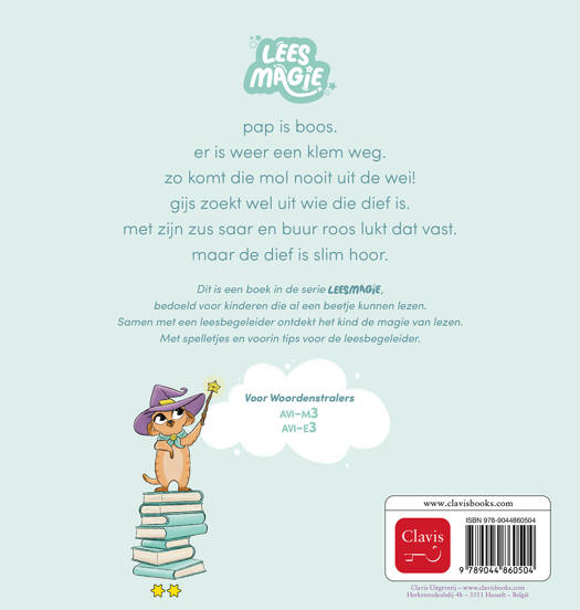 pap is boos. er is weer een klem weg. zo komt die mol nooit uit de wei! gijs zoekt wel uit wie die dief is. met zijn zus saar en buur roos lukt dat vast. maar de dief is slim hoor. Dit is een boek in de serie Leesmagie, bedoeld voor kinderen die al een beetje kunnen lezen. Samen met een leesbegeleider ontdekt het kind de magie van lezen. Met spelletjes en voorin tips voor de leesbegeleider.