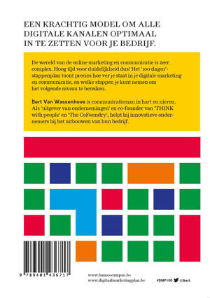 Een krachtig model om alle digitale kanalen optimaal in te zetten voor je bedrijf De wereld van de online marketing en communicatie is zeer complex. Hoog tijd voor duidelijkheid dus! Het '100 dagen'- stappenplan toont precies hoe ver je staat in je digitale marketing en communicatie, en welke stappen je kunt nemen om het volgende niveau te bereiken. 'Dit is een boek dat zonder omwegen de essentie van digitale marketing uit de doeken doet. Complexe zaken in weinig woorden eenvoudig uitleggen is weinigen gegeven. Bert doet het. #helder #strak' Tom Van de Cruys - CEO Lampiris 'Dit boek is een fantastische bron voor elke ondernemer en zelfstandige om te begrijpen waarom iedereen vandaag online kan en moet zijn. Zowel een start-up met wereldwijde ambities, een bloeiend lokaal familiebedrijf, als de bakker om de hoek zullen de vruchten dragen van het praktische advies in dit boek.' Julien Blanchez - Group Marketing Manager Google 'Consumenten worden steeds meer beïnvloed door een brede waaier aan digitale kanalen. Dit boek is een handige leidraad om de rol en relevantie van deze nieuwe media te toetsen aan je marketingobjectieven. Een aanrader, zowel voor de student als de ervaren marketer.' Karel Demeester - Associate Director Digital, Coca-Cola Enterprises 'Ook voor kleine en middelgrote ondernemingen en vrije beroepen bieden de nieuwe media haalbare en betaalbare mogelijkheden. Een goed advies en een praktische begeleiding op maat van het bedrijf blijven van groot belang om deze nieuwe mogelijkheden zo doeltreffend mogelijk in te zetten. Dit boek is daartoe een uitstekende wegwijzer.' Karel Van Eetvelt - Gedelegeerd bestuurder UNIZO, de Unie van Zelfstandige Ondernemers 'In dit boek maakt Bert Van Wassenhove de vele uitdagingen van de nieuwe media begrijpelijk en toepasbaar. Met concrete aanbevelingen voor marketeers en ondernemers beschrijft hij hoe efficiënt om te gaan met nieuwe media in de dagelijkse praktijk.' Jo Caudron, auteur van Media Morgen & Founding Partner DearMedia