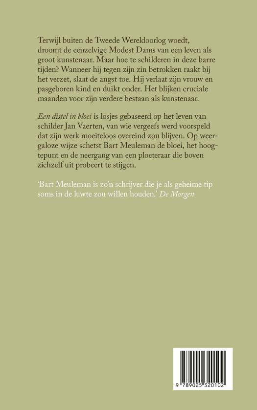 Een distel in bloei is losjes gebaseerd op het leven van schilder Jan Vaerten, van wie vergeefs werd voorspeld dat zijn werk moeiteloos overeind zou blijven. Op weergaloze wijze schetst Bart Meuleman de bloei, het hoogtepunt en de neergang van een ploeteraar die boven zichzelf uit probeert te stijgen.