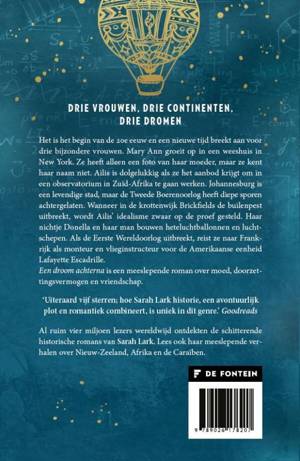 Het is het begin van de 20e eeuw en een nieuwe tijd breekt aan voor drie bijzondere vrouwen. Mary Ann groeit op in een weeshuis in New York. Niemand weet dat ze de dochter is van wijlen Haily Hard. Ze heeft alleen een foto van haar moeder, maar ze kent haar naam niet... Ailis was dolgelukkig toen ze in 1903 het aanbod kreeg om in een observatorium in Zuid-Afrika te gaan werken. Johannesburg is een levendige stad, maar de Tweede Boerenoorlog heeft diepe sporen nagelaten. Donella en haar man bouwen heteluchtballonnen en luchtschepen. Als de Eerste Wereldoorlog uitbreekt, reist ze naar Frankrijk als monteur en vlieginstructeur voor de Amerikaanse eenheid Lafayette Escadrille. Leef mee met deze vrouwen die hun weg vinden in een nieuwe wereld. 'Een droom achterna' is het tweede boek in de Wereld-vrouwenserie van Sarah Lark. Het verhaal van Mary Ann, Ailis, Donella en hun families begon in 'Tot aan de sterren'.