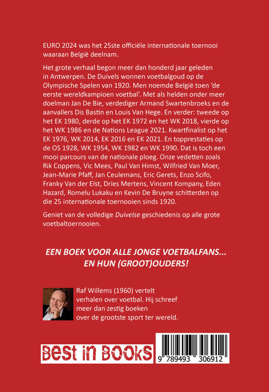 Wint België in Duitsland EURO 2024? Waarom niet? Met Doku, Bakayoko, Lukaku en De Bruyne hebben we een paar fantastische spelers. EURO 2024 is het 25ste officiële internationale toernooi waaraan België deelneemt. Het grote verhaal begon meer dan honderd jaar geleden in Antwerpen. De Duivels wonnen voetbalgoud op de Olympische Spelen van 1920. Men noemde België toen ‘de eerste wereldkampioen voetbal’. Met als helden onder meer doelman Jan De Bie, verdediger Armand Swartenbroeks en de aanvallers Dis Bastin en Louis Van Hege. En verder: tweede op het EK 1980, derde op het EK 1972 en het WK 2018, vierde op het WK 1986 en de Nations League 2021. Kwartfinalist op het EK 1976, WK 2014, EK 2016 en EK 2021. En topprestaties op de OS 1928, WK 1954, WK 1982 en WK 1990. Dat is toch een mooi parcours van de nationale ploeg. Onze vedetten zoals Rik Coppens, Vic Mees, Paul Van Himst, Wilfried Van Moer, Jean-Marie Pfaff, Jan Ceulemans, Eric Gerets, Enzo Scifo, Franky Van der Elst, Dries Mertens, Vincent Kompany en Eden Hazard schitterden op die 24 internationale toernooien sinds 1920. Herhaalt België de stunt van toen? En winnen ze in Duitsland EURO 2024? Wie weet! Geniet van de volledige Duivelse geschiedenis op alle grote voetbaltoernooien.