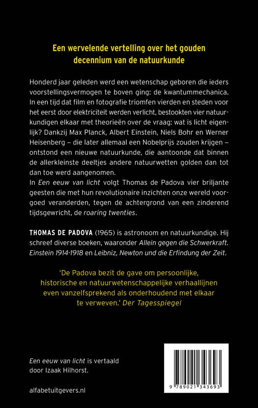 In Een eeuw van licht wekt Thomas de Padova de koortsachtige zoektocht van deze vier genieën naar antwoorden tot leven. Wat gaf hun creativiteit vleugels? Welke ideeën brachten de inzichten die onze wereld voorgoed zouden veranderen en die leidden tot uitvindingen als lasers, chips en de atoombom? Een fantastisch boek over het gouden decennium van de natuurkunde tegen de achtergrond van een zinderend tijdsgewricht, de roaring twenties.