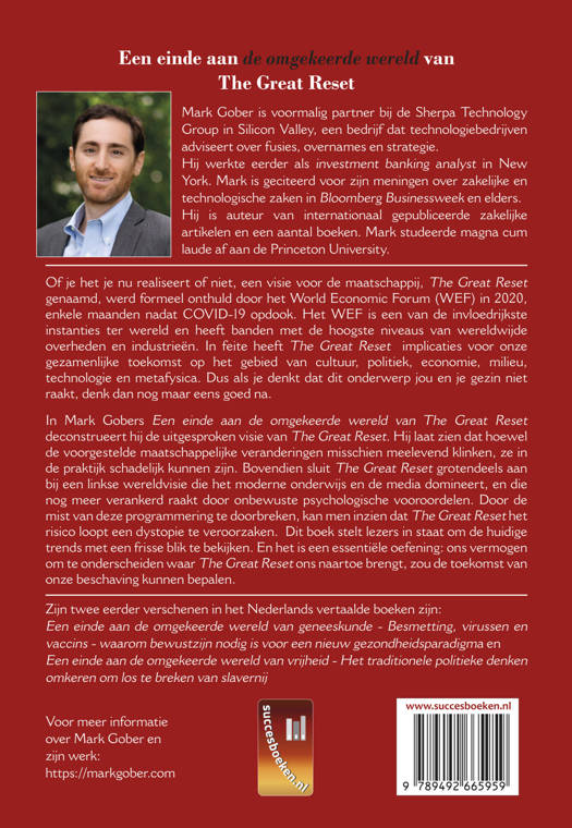 In Mark Gobers Een einde aan de omgekeerde wereld van The Great Reset deconstrueert hij de uitgesproken visie van The Great Reset. Hij laat zien dat hoewel de voorgestelde maatschappelijke veranderingen misschien meelevend klinken, ze in de praktijk schadelijk kunnen zijn. Bovendien sluit The Great Reset grotendeels aan bij een linkse wereldvisie die het moderne onderwijs en de media domineert, en die nog meer verankerd raakt door onbewuste psychologische vooroordelen. Door de mist van deze programmering te doorbreken, kan men inzien dat The Great Reset het risico loopt een dystopie te veroorzaken. Dit boek stelt lezers in staat om de huidige trends met een frisse blik te bekijken. En het is een essentiële oefening: ons vermogen om te onderscheiden waar The Great Reset ons naartoe brengt, zou de toekomst van onze beschaving kunnen bepalen.