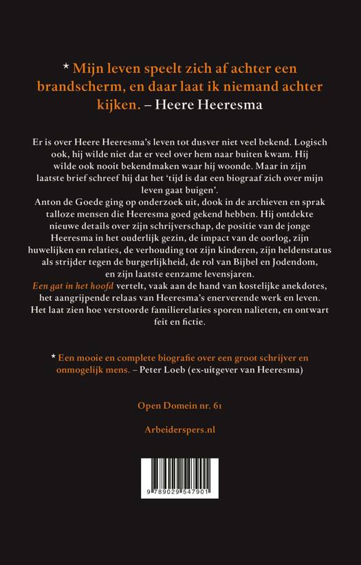 Anton de Goede ging op onderzoek uit, dook in de archieven en sprak talloze mensen die Heeresma goed gekend hebben. Hij ontdekte nieuwe details over zijn schrijverschap, de positie van de jonge Heeresma in het ouderlijk gezin, de impact van de oorlog, zijn huwelijken en relaties, de verhouding tot zijn kinderen, zijn heldenstatus als strijder tegen de burgerlijkheid, de rol van Bijbel en Jodendom, en zijn laatste eenzame levensjaren.