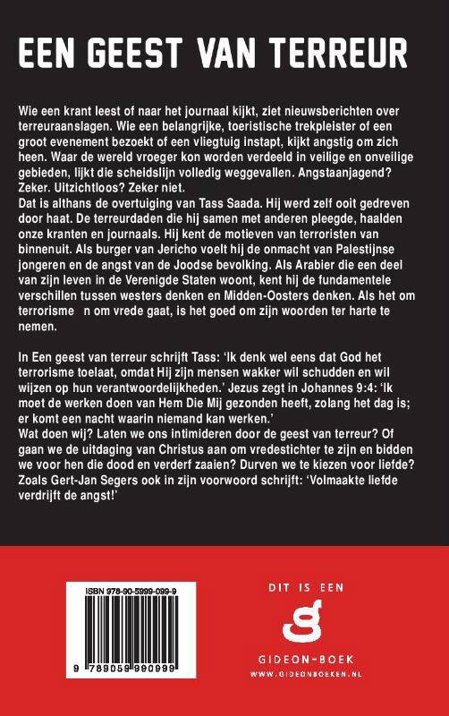 Wie een krant leest of naar het journaal kijkt, ziet nieuwsberichten over terreuraanslagen. Wie een belangrijke, toeristische trekpleister of een groot evenement bezoekt of een vliegtuig instapt, kijkt angstig om zich heen. Waar de wereld vroeger kon worden verdeeld in veilige en onveilige gebieden, lijkt die scheidslijn volledig weggevallen. Angstaanjagend? Zeker. Uitzichtloos? Zeker niet. Dat is althans de overtuiging van Tass Saada. Hij werd zelf ooit gedreven door haat. De terreurdaden die hij samen met anderen pleegde, haalden onze kranten en journaals. Hij kent de motieven van terroristen van binnenuit. Als burger van Jericho voelt hij de onmacht van Palestijnse jongeren en de angst van de Joodse bevolking. Als Arabier die een deel van zijn leven in de Verenigde Staten woont, kent hij de fundamentele verschillen tussen westers denken en Midden-Oosters denken. Als het om terrorisme én om vrede gaat, is het goed om zijn woorden ter harte te nemen.