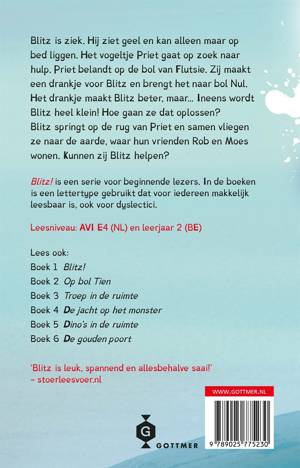 Blitz is ziek. Hij ziet geel en kan alleen maar op bed liggen. Het vogeltje Priet wil hem beter maken en gaat op zoek naar hulp. Priet komt terecht op de bol van Flutsie, die een drankje voor Blitz maakt. Het drankje werkt, maar heeft ook een nare bijwerking: Blitz wordt niet alleen beter, maar ook heel klein! Hoe gaan ze dat oplossen? Naar Flutsie gaan durft Blitz niet. Hij springt op de rug van Priet en samen vliegen ze naar de aarde, waar Rob en Moes wonen. Zouden zij hem kunnen helpen?