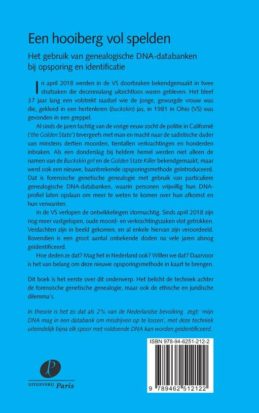 In april 2018 werden in de VS doorbraken bekendgemaakt in twee strafzaken die decennialang uitzichtloos waren gebleven. Het bleef 37 jaar lang een volstrekt raadsel wie de jonge, gewurgde vrouw was die, gekleed in een hertenleren (buckskin) jas, in 1981 in Ohio (VS) was gevonden in een greppel. Al sinds de jaren tachtig van de vorige eeuw zocht de politie in Californië (‘the Golden State’) tevergeefs met man en macht naar de sadistische dader van minstens dertien moorden, tientallen verkrachtingen en honderden inbraken. Als een donderslag bij heldere hemel werden niet alleen de namen van de Buckskin girl en de Golden State Killer bekendgemaakt, maar werd ook een nieuwe, baanbrekende opsporingsmethode geïntroduceerd. Dat is forensische genetische genealogie met gebruik van particuliere genealogische DNA-databanken, waarin personen vrijwillig hun DNA-profiel laten opslaan om meer te weten te komen over hun afkomst en hun verwanten. In de VS verlopen de ontwikkelingen stormachtig. Sinds april 2018 zijn nog meer vastgelopen, oude moord- en verkrachtingszaken vlot getrokken. Verdachten zijn in beeld gekomen, en al enkele hiervan zijn veroordeeld. Bovendien is een groot aantal onbekende doden na vele jaren alsnog geïdentificeerd. Hoe deden ze dat? Mag het in Nederland ook? Willen we dat? Daarvoor is het van belang om deze nieuwe opsporingsmethode in kaart te brengen. Dit boek is het eerste over dit onderwerp. Het belicht de techniek achter de forensische genetische genealogie, maar ook de ethische en juridische dilemma’s.