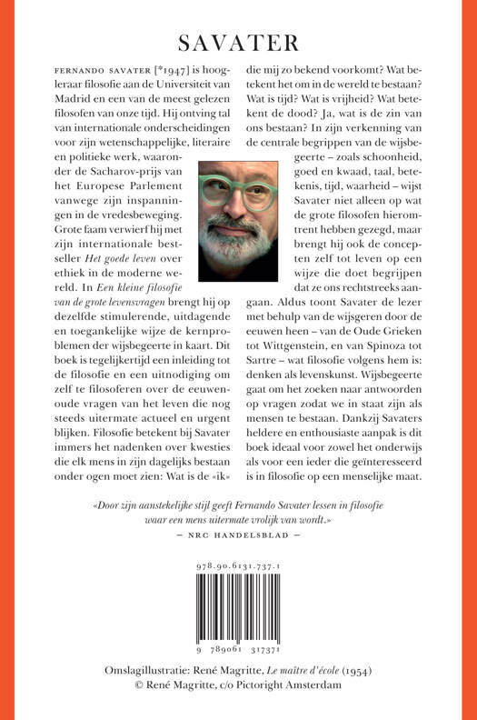 In «Een kleine filosofie van de grote levensvragen» blijken deze eeuwenoude problemen nog steeds hoogst actueel te zijn. In dit boek toont Savater de lezer met hulp van de grote wijsgeren – van de Oude Grieken tot Ludwig Wittgenstein, en van Spinoza tot Simone de Beauvoir – wat filosofie is: denken als levenskunst. Wijsbegeerte gaat immers om niets anders dan om vragen waarop wij mensen antwoord moeten vinden om als waarachtig mens te kunnen bestaan. Dit boek is zo van bijzonder belang voor een ieder die zelf wil filosoferen, en ideaal voor zowel het onderwijs als voor iedereen die geïnteresseerd is in filosofie op een menselijke maat.