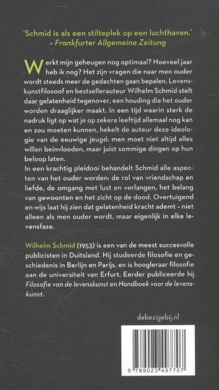Werkt mijn geheugen nog optimaal? Hoeveel jaar heb ik nog? Het zijn vragen die naar men ouder wordt steeds meer de gedachten gaan bepalen. Levenskunstfilosoof en bestsellerauteur Wilhelm Schmid stelt daar gelatenheid tegenover, een houding die het ouder worden draaglijker maakt. In een tijd waarin sterk de nadruk ligt op wat je op zekere leeftijd allemaal nog kan en zou moeten kunnen, hekelt de auteur deze ideologie van de eeuwige jeugd: men moet niet altijd maar alles willen beïnvloeden, maar juist sommige dingen op hun beloop laten.