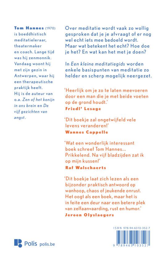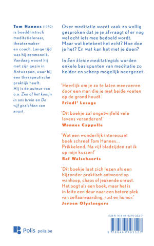 Over meditatie wordt vaak zo wollig gesproken dat je je afvraagt of er nog wel echt iets mee bedoeld wordt. Maar wat betekent het echt? Hoe doe je het? En wat kan het met je doen? In Een kleine meditatiegids worden enkele basispunten van meditatie zo helder en scherp mogelijk neergezet. In de eerste plaats is het een handleiding. Drie korte hoofdstukken geven een praktische beschrijving van drie eenvoudige meditatievormen uit de boeddhistische traditie waarmee je zelf meteen aan de slag kunt. De drie meditatiehandleidingen worden telkens gevolgd door wat achtergrondinformatie. Het zijn verdiepende teksten waarin Tom Hannes veelvoorkomende misverstanden en valkuilen beschrijft.
