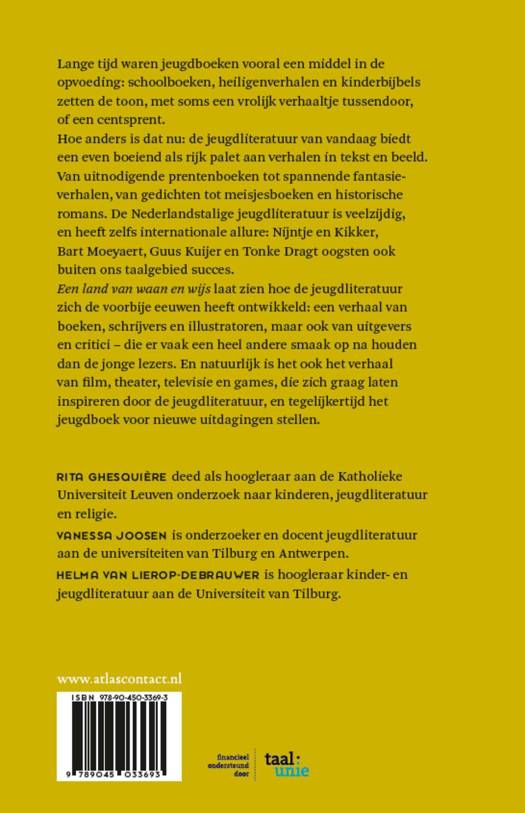 Lange tijd waren jeugdboeken vooral een middel in de opvoeding: schoolboeken, heiligenverhalen en kinderbijbels zetten de toon, met soms een vrolijk verhaaltje tussendoor, of een centsprent. Hoe anders is dat nu: de jeugdliteratuur van vandaag biedt een even boeiend als rijk palet aan verhalen in tekst en beeld. Van uitnodigende prentenboeken tot spannende fantasieverhalen, van gedichten tot meisjesboeken en historische romans. De Nederlandstalige jeugdliteratuur is veelzijdig, en heeft zelfs internationale allure: Nijntje en Kikker, Bart Moeyaert, Guus Kuijer en Tonke Dragt oogsten ook buiten ons taalgebied succes. Een land van waan en wijs laat zien hoe de jeugdliteratuur zich de voorbije eeuwen heeft ontwikkeld: een verhaal van boeken, schrijvers en illustratoren, maar ook van uitgevers en critici – die er vaak een heel andere smaak op na houden dan de jonge lezers. En natuurlijk is het ook het verhaal van film, theater, televisie en games, die zich graag laten inspireren door de jeugdliteratuur, en tegelijkertijd het jeugdboek voor nieuwe uitdagingen stellen.