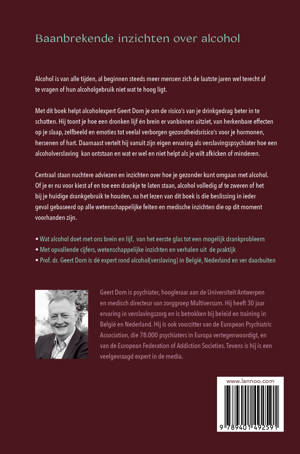 Met dit boek helpt alcoholexpert Geert Dom je om de risico's van je drinkgedrag beter in te schatten. Hij toont je hoe een dronken lijf én brein er vanbinnen uitziet, van herkenbare effecten op je slaap, zelfbeeld en emoties tot veelal verborgen gezondheidsrisico's voor je hormonen, hersenen of hart. Daarnaast vertelt hij vanuit zijn eigen ervaring als verslavingspsychiater hoe een alcoholverslaving kan ontstaan en wat er wel en niet helpt als je wilt afkicken of minderen.