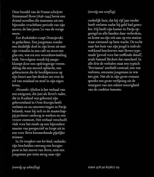 Deze bundel van de Franse schrijver Emmanuel Bove (1898-1945) bevat een drietal novellen die stammen uit een bijzonder vruchtbare periode van zijn œuvre, de late jaren ’20 van de vorige eeuw. Een Raskolnikov roept Dostojevski in gedachten. Een jongeman zonder een duidelijk doel in zijn leven zit met zijn vriendin in een café en stoot een glas om, wat tot een woordenwisseling leidt. Vervolgens wordt hij aangeklampt door een opdringerige vreemdeling die een moord opbiecht, een gebeurtenis die de hoofdpersoon op zijn beurt aan het denken zet over de rol van misdaad en straf in zijn eigen leven. Alexandre Aftalion is het verhaal van een emigrant, die (net als Bove’s vader, die in Rusland was geboren) zijn geboorteland in Oost-Europa heeft verlaten en na omzwervingen in Parijs belandt, waar hij zich in de maatschappij probeert omhoog te werken en een vrouw ontmoet. Het verhaal verschuift vlak voor het einde op een bijzondere manier van perspectief en loopt uit in een voor Bove kenmerkende pijnlijke mineur. In De terugkeer van het kind, ondanks zijn bescheiden omvang een hoogtepunt in het œuvre van Bove, reist een jongeman per trein terug naar zijn ouder lijk huis, dat hij vijf jaar eerder heeft verlaten nadat hij geld had gestolen. Hij heeft zijn kamer in Parijs opgezegd en alle banden daar verbroken, en komt na zijn reis aan op een station waar niemand op hem wacht. De tocht naar het huis van zijn jeugd is indrukwekkend beschreven met Boves typerende ‘gevoel voor het tre^ende detail’, zoals Samuel Beckett dat omscheef. In alle drie de verhalen staat een typisch ‘Boviaanse’ antiheld centraal, een wat verloren, eenzame jongeman in wie iets gist. Net als in zijn grote romans spreekt een grote verfijning uit de weergave van een zekere treurigheid van de condition humaine