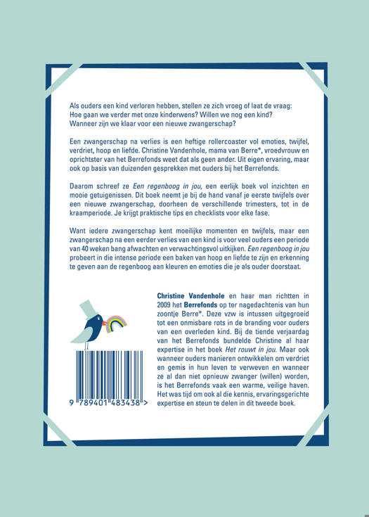 Daarom schreef ze Een regenboog in jou, een eerlijk boek vol inzichten en mooie getuigenissen. Dit boek neemt je bij de hand vanaf je eerste twijfels over een nieuwe zwangerschap, doorheen de verschillende trimesters, tot in de kraamperiode. Je krijgt praktische tips en checklists voor elke fase.