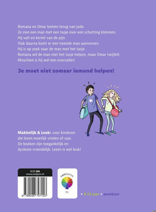 Een man wordt achtervolgd en springt over een schutting. Romana en Omar hebben alles gezien en wijzen de achtervolgers de verkeerde kant op. Ze helpen de man die door zijn val nu niet meer kan lopen, maar helpen ze de juiste persoon? Of is dit juist de boef? Hoe komt hij aan die tas vol juwelen? Spannend verhaal op AVI E5 voor kinderen van 9-12 jaar in de serie ‘Makkelijk & Leuk’, speciaal voor kinderen die lezen moeilijk vinden of saai. Zo krijgen zij weer plezier in lezen. Dyslexievriendelijk!
