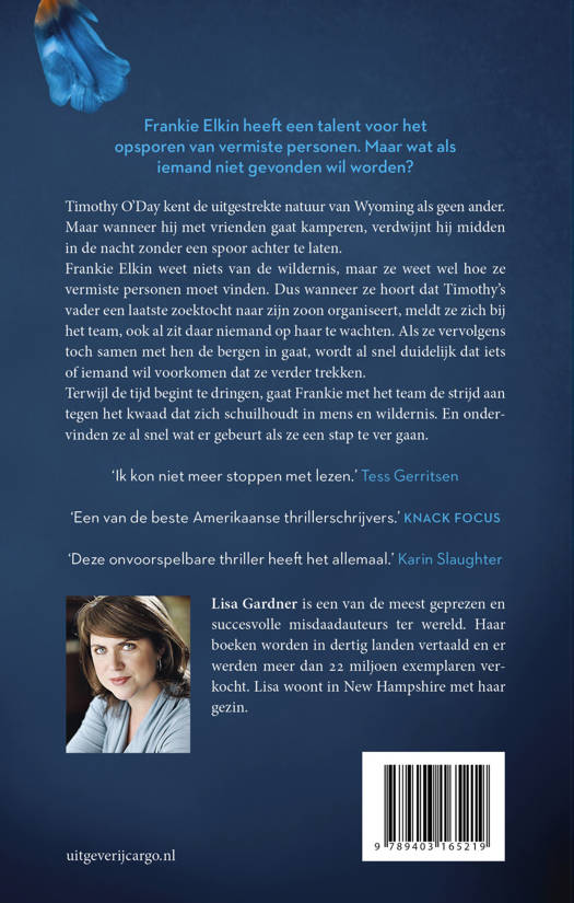 <>Deel twee van een bloedstollende thrillerserie met de eigenzinnige Frankie Elkin in de hoofdrol.<>Timothy O’Day kent de uitgestrekte natuur van Wyoming als geen ander. Maar wanneer hij met vrienden gaat kamperen, verdwijnt hij midden in de nacht zonder een spoor achter te laten.<>Frankie Elkin weet niets van de wildernis, maar ze weet wel hoe ze vermiste personen moet vinden. Dus wanneer ze hoort dat Timothy’s vader een laatste zoektocht naar zijn zoon organiseert, meldt ze zich bij het team, ook al zit daar niemand op haar te wachten. Als ze vervolgens toch samen met het reddingsteam de bergen in gaat, wordt al snel duidelijk dat iets of iemand wil voorkomen dat ze verder trekken. Terwijl de tijd begint te dringen, gaat Frankie met het team de strijd aan tegen het kwaad dat zich schuilhoudt in mens en wildernis. En ondervindt al snel wat er gebeurt als ze een stap te ver gaan.