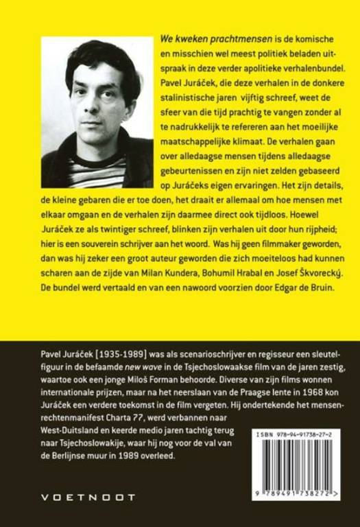 'We kweken prachtmensen' is de komische en misschien wel meest politiek beladen uitspraak in deze verder apolitieke bundel. Pavel Juracek, die deze verhalen in de donkere stalinistische jaren vijftig schreef, weet de sfeer van die tijd prachtig te vangen zonder al te nadrukkelijk te refereren aan het moeilijke maatschappelijke klimaat. De verhalen gaan over alledaagse mensen tijdens alledaagse gebeurtenissen en zijn niet zelden gebaseerd op Juraceks eigen ervaringen.