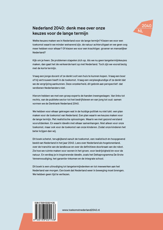 Hierom hebben we met een groep experts de handen ineengeslagen. Van links tot rechts, van de publieke sector tot het bedrijfsleven en van jong tot oud: samen vormen we de Denktank Nederland 2040. We hebben voor elkaar gekregen wat in de huidige politiek nu niet lukt: een plan maken voor de toekomst van Nederland. Een plan waarin we keuzes maken voor de lange termijn. Met realistische oplossingen. Waarin we met gezond verstand vooruitdenken. En waarin ideeën met elkaar samenhangen. Niet alleen voor onze toekomst, maar ook voor de toekomst van onze kinderen. Zodat onze kinderen het beter krijgen dan wij. Dit boek schetst, terugkijkend vanuit de toekomst, een realistisch én hoopgevend beeld van Nederland in het jaar 2040. Lees over Nederland als hogelonenland, over de transitie van de landbouw en over de definitieve doorbraak van de robot. Zie hoe we ruimte maken voor wonen in het groen, voor bedrijvigheid én voor de natuur. En verdiep je in inspirerende ideeën, zoals het Deltaprogramma De Grote Vereenvoudiging, het garantie-inkomen en de integrale school.