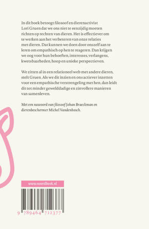 In dit boek betoogt filosoof en dierenactivist Lori Gruen dat we ons niet te eenzijdig moeten richten op rechten van dieren. Het is effectiever om te werken aan het verbeteren van onze relaties met dieren. Dat kunnen we doen door onszelf aan te leren om empathisch op hen te reageren. Dan krijgen we oog voor hun behoeften, interesses, verlangens, kwetsbaarheden, hoop en unieke perspectieven.
