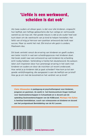 Dit boek vertrekt vanuit de ervaring van kinderen en geeft ouders een beter inzicht in wat een scheidingsproces met kinderen doet. Het boek zoekt naar een antwoord op wat kinderen bij scheiding écht nodig hebben. Verbinding is hierbij het sleutelwoord. De auteurs laten zich inspireren door hun jarenlange ervaring in het werk met kinderen en ouders en door de inzichten uit recent onderzoek. Hoe vertel je je kinderen dat je gaat scheiden? Hoe kom je tot een goede verblijfsregeling, die aangepast is aan de leeftijd van je kind? Hoe ga je om met de boosheid en het verdriet van je kind?
