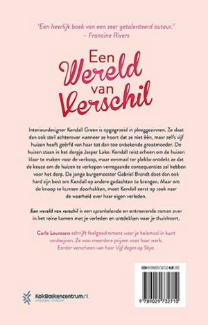 ‘Een wereld van verschil’ van Carla Laureano is een psychologische feelgoodroman. Interieurdesigner Kendall Green is opgegroeid in pleeggezinnen. Ze slaat dan ook steil achterover wanneer ze hoort dat ze niet één, maar liefst vijf huizen heeft geërfd van haar tot dan toe onbekende grootmoeder. De huizen staan in het dorpje Jasper Lake. Kendall reist erheen om de huizen klaar te maken voor de verkoop, maar eenmaal ter plekke ontdekt ze dat de keuze om de huizen te verkopen verregaande consequenties zal hebben voor het dorp. De jonge burgemeester Gabriel Brandt doet dan ook hard zijn best om Kendall op andere gedachten te brengen. Maar om de knoop te kunnen doorhakken, moet Kendall eerst op zoek naar de waarheid over haar eigen verleden.