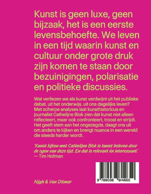 Kunst is geen luxe, geen bijzaak, het is een eerste levensbehoefte. We leven in een tijd waarin kunst en cultuur onder grote druk zijn komen te staan door bezuinigingen, polarisatie en politieke discussies. Wat verliezen we als kunst verdwijnt uit het publieke debat, uit het onderwijs, uit ons dagelijks leven? Met scherpe analyses laat kunsthistoricus en journalist Cathelijne Blok zien dat kunst niet alleen reflecteert, maar ook confronteert, troost en strijdt. Het geeft stem aan het ongezegde, daagt ons uit om anders te kijken en brengt nuance in een wereld die steeds harder wordt.