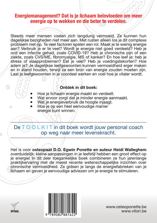 Het is voor osteopaat D.O. Egwin Ponette en auteur Heidi Walleghem overduidelijk: kleine aanpassingen in je leefstijl hebben een groot effect op je energie! In dit zeer toegankelijke boek combineren ze hun jarenlange praktijkervaring met de meest recente wetenschappelijke inzichten over chronische vermoeidheid. Ze gidsen je langs de energiefabrieken van je lichaam en geven je eenvoudige adviezen om je energie te stimuleren.