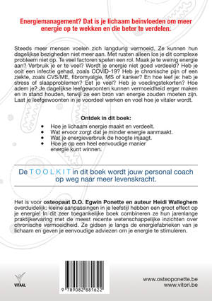 Steeds meer mensen voelen zich langdurig vermoeid. Ze kunnen hun dagelijkse bezigheden niet meer aan. Met rusten alleen los je dit complexe probleem niet op. Te veel factoren spelen een rol. Maak je te weinig energie aan? Verbruik je er te veel? Wordt je energie niet goed verdeeld? Heb je ooit een infectie gehad, zoals COVID-19? Heb je chronische pijn of een ziekte, zoals CVS/ME, fibromyalgie, MS of kanker? En hoe leef je: heb je stress of slaapproblemen? Eet je veel? Heb je voedingstekorten? Hoe adem je? Je dagelijkse leefgewoonten kunnen vermoeidheid erger maken en in stand houden, terwijl ze een bron van energie zouden moeten zijn. Laat je leefgewoonten in je voordeel werken en voel hoe je vitaler wordt.