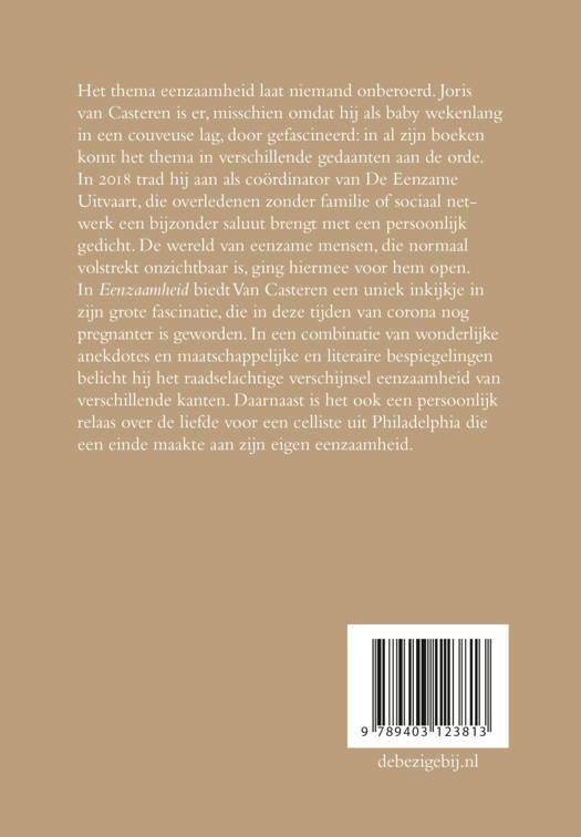 Het thema eenzaamheid laat niemand onberoerd. Joris van Casteren is er, misschien omdat hij als baby wekenlang in een couveuse lag, afgescheiden van enig menselijk contact, door gefascineerd: in al zijn boeken komt het thema in verschillende gedaanten aan de orde. In 2018 trad hij aan als coördinator van de stichting De Eenzame Uitvaart, die overledenen zonder familie of sociaal netwerk een bijzonder saluut brengt met een persoonlijk gedicht. De wereld van eenzame mensen, die normaal volstrekt onzichtbaar is, ging hiermee voor hem open. In Eenzaamheid biedt Van Casteren een uniek inkijkje in zijn grote fascinatie, die in deze tijden van corona nog pregnanter is geworden. In een combinatie van wonderlijke anekdotes en maatschappelijke en literaire bespiegelingen belicht hij het raadselachtige verschijnsel eenzaamheid van verschillende kanten. Daarnaast is het ook een persoonlijk relaas over de liefde voor een celliste uit Philadelphia die een einde maakte aan zijn eigen eenzaamheid.