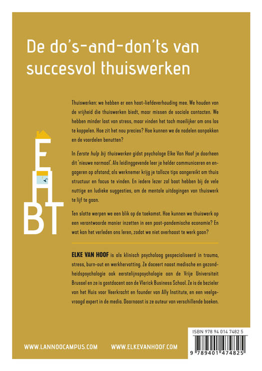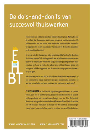 Thuiswerken: we hebben er een haat-liefdeverhouding mee. We houden van de vrijheid die thuiswerken biedt, maar missen de sociale contacten. We hebben minder last van stress, maar vinden het toch moeilijker om ons los te koppelen. Hoe zit het nou precies? Hoe kunnen we de nadelen aanpakken en de voordelen benutten? In Eerste hulp bij thuiswerken gidst psychologe Elke Van Hoof je doorheen dit 'nieuwe normaal'. Als leidinggevende leer je helder communiceren en engageren op afstand; als werknemer krijg je talloze tips aangereikt om thuis structuur en focus te vinden. En iedere lezer zal baat hebben bij de vele nuttige en ludieke suggesties, om de mentale uitdagingen van thuiswerk te lijf te gaan. Ten slotte werpen we een blik op de toekomst. Hoe kunnen we thuiswerk op een verantwoorde manier inzetten in een post-pandemische economie? En wat kan het verleden ons leren, zodat we niet overhaast te werk gaan?
