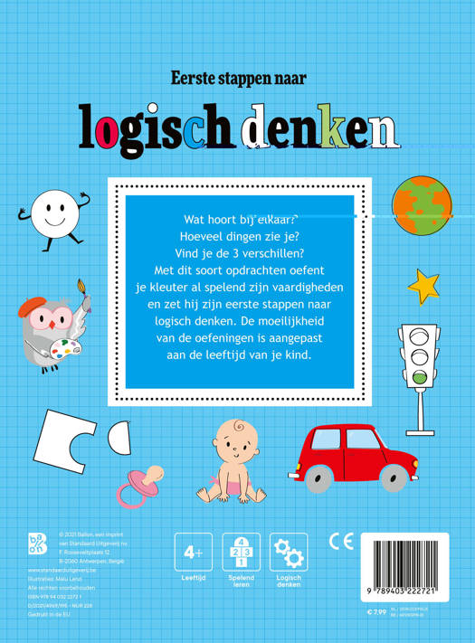 Wat hoort bij elkaar? Hoeveel dingen zie je? Vind je de 3 verschillen? Met dit soort opdrachten oefent je kleuter al spelend zijn vaardigheden en zet hij zijn eerste stappen naar logisch denken. De moeilijkheid van de oefeningen is aangepast aan de leeftijd van vier en vijf jaar. Logisch en probleemoplossend denken krijgt steeds meer aandacht op school. Met dit boek kunnen kinderen leuke, toegankelijke oefeningen maken die de hersenen laten kraken en die trainen in probleemoplossend denken. Met oplossingen zodat je kind zijn antwoorden kan controleren.