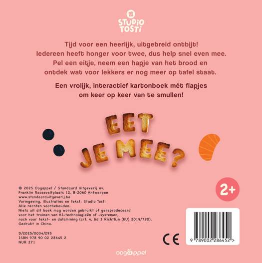 Tijd voor een heerlijk, uitgebreid ontbijt!Iedereen heeft honger voor twee, dus help snel even mee.Pel een eitje, neem een hapje van het brood en ontdek wat voor lekkers er nog meer op tafel staat.Een vrolijk, interactief kartonboek mét flapjes om keer op keer van te smullen!