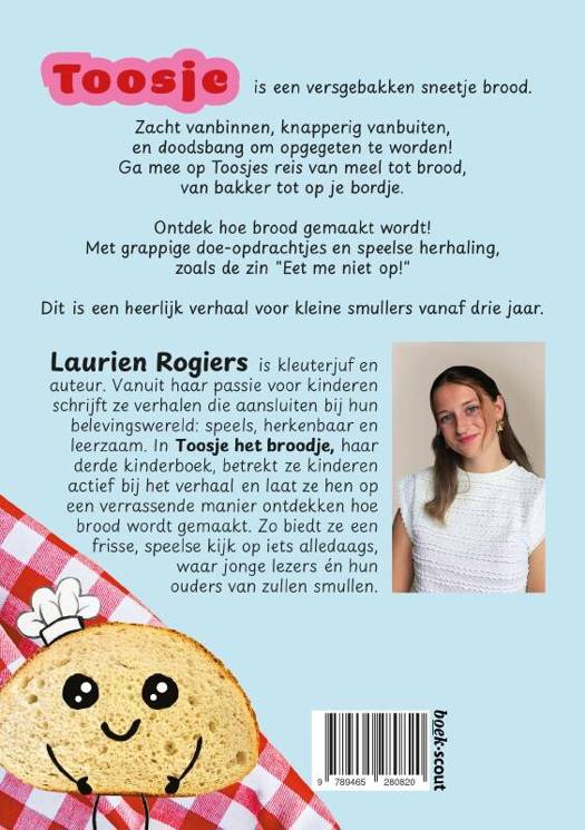 Toosje is een versgebakken sneetje brood. Zacht vanbinnen, knapperig vanbuiten, en doodsbang om opgegeten te worden! Ga mee op Toosjes reis van meel tot brood, van bakker tot op je bordje. Ontdek hoe brood gemaakt wordt! Met grappige doe-opdrachtjes en speelse herhaling, zoals de zin "Eet me niet op!" Dit is een heerlijk verhaal voor kleine smullers vanaf drie jaar.