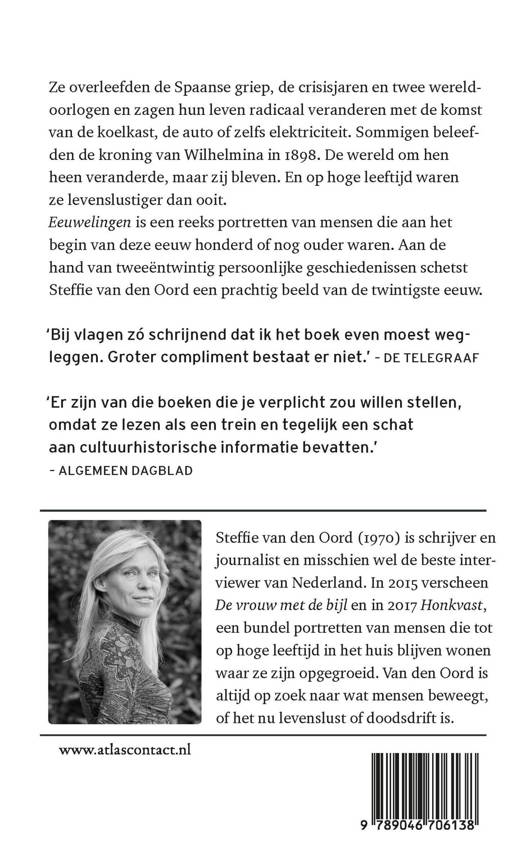 Aan de hand van tweeëntwintig persoonlijke geschiedenissen schetst Steffie van den Oord in 'Eeuwlingen' een prachtig beeld van de twintigste eeuw.Ze overleefden de Spaanse griep, de crisisjaren en twee wereldoorlogen en zagen hun leven radicaal veranderen met de komst van de koelkast, de auto of zelfs elektriciteit. Sommigen beleefden de kroning van Wilhelmina in 1898. De wereld om hen heen veranderde, maar zij bleven. En op hoge leeftijd waren ze misschien wel levenslustiger dan ooit. Eeuwelingen is een reeks portretten van mensen die aan het begin van deze eeuw honderd of nog ouder waren.