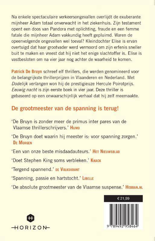 Kleindochter Elise is er van overtuigd dat haar grootvader uit de weg werd geruimd om zijn erfenis sneller buit te maken en vreest dat hij niet het enige slachtoffer is. Voor mijnheer Adam is het eeuwig nacht, maar Elise is vastbesloten elke steen om te draaien om alsnog gerechtigheid te krijgen.