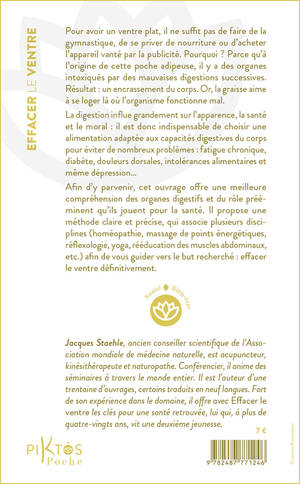 Pour avoir un ventre plat, il ne suffit pas de faire de la gymnastique, de se priver de nourriture ou d’acheter l’appareil vanté par la publicité. Pourquoi ? Parce qu’à l’origine de cette poche adipeuse, il y a des organes intoxiqués par des mauvaises digestions successives. Résultat : un encrassement du corps. Or, la graisse aime à se loger là où l’organisme fonctionne mal. La digestion influe grandement sur l'apparence, la santé et le moral : il est donc indispensable de choisir une alimentation adaptée aux capacités digestives du corps pour éviter de nombreux problèmes : fatigue chronique, diabète, douleurs dorsales, intolérances alimentaires et même dépression… Afin d'y parvenir, cet ouvrage offre une meilleure compréhension des organes digestifs et du rôle prééminent qu'ils jouent pour la santé. Il propose une méthode claire et précise, qui associe plusieurs disciplines (homéopathie, massage de points énergétiques, réflexologie, yoga, rééducation des muscles abdominaux, etc.) afin de vous guider vers le but recherché : effacer le ventre définitivement.