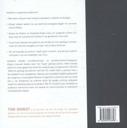 Ondanks talrijke sensibiliserings- en communicatiecampagnes blijven mensen steeds weer het ‘foute’ gedrag stellen. Want tussen weten en doen gaapt een kloof van verleidingen en gewoontes. Dankzij het handige praktijkboek ‘Effectief gedrag veranderen met het 7E-model’ leert u precies hoe u dit probleem kan aanpakken. Na elk hoofdstuk vindt u een handige checklist voor toepassing in de praktijk. Met een doordacht beleid gebaseerd op nudging en keuzeoptimalisatie en gerichte communicatie op maat kan u uw doelgroep op subtiele wijze de goede richting uitduwen zodat hun gedrag blijvend verandert. Het 7E-model is een duidelijk en praktisch werkinstrument om beleid en communicatie te realiseren met blijvende impact.