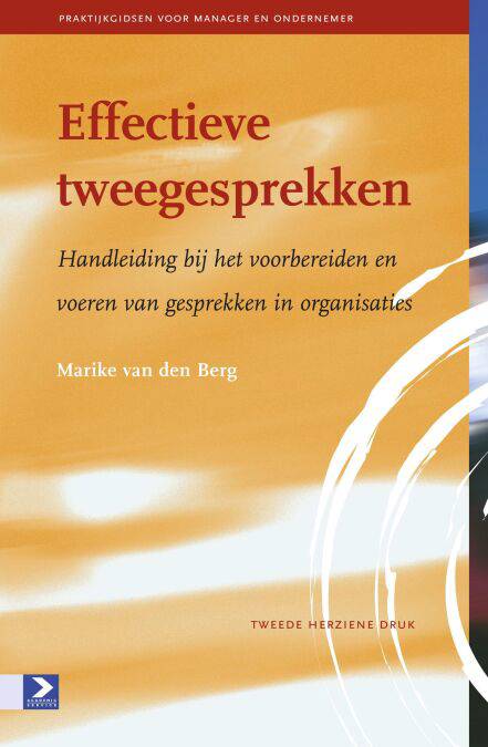 Hoe leidt u als leidinggevende de gesprekken met uw medewerkers in goede banen, en houdt u ook bij kritiek of slecht nieuws de werkrelatie prettig? Hoe geeft u op een motiverende manier feedback? En op welke manier laat u een kandidaat optimaal tot zijn recht komen tijdens een selectiegesprek? Op deze en andere vragen geeft Effectieve tweegesprekken antwoord. Met de elementaire gespreksvaardigheden uit dit boek staat u sterker in uw schoenen in elk gesprek. Het voert u per gesprekstype vlot van voorbereiding naar geslaagde afronding. Aan bod komen onder meer: het selectiegesprek; het functioneringsgesprek; het slechtnieuwsgesprek; het geven van feedback; het hanteren van conflicten. In deze tweede herziene druk zijn de gespreksvormen geactualiseerd en wordt er extra aandacht besteed aan boodschappen die niet direct aan de oppervlakte liggen. Bovendien zijn er twee nieuwe hoofdstukken toegevoegd: feedback geven en ontwikkelgesprekken voeren. Marike van den Berg (1963) startte als trainer communicatietechnieken bij Boertien & Partners. Vervolgens werkte zij bij de anwb, aanvankelijk als organisatieadviseur en aansluitend als leidinggevende van een grote inspectieafdeling. Ze stapte in 2000 over naar adviesbureau Ardis, waar ze zich richtte op managementtrainingen en het begeleiden van managementteams. Sinds 2006 ontwikkelt ze hrm-beleid voor de Rijksoverheid. De serie Praktijkgidsen voor Manager en Ondernemer biedt een praktische training in managementvaardigheden. Met een minimum aan theorie en een maximum aan praktische richtlijnen verwerft u in twee avonden lezen een schat aan informatie en vaardigheden. Daarnaast zijn de boeken ideaal als naslagwerk. De Praktijkgidsen voor Manager en Ondernemer worden geschreven door mensen die op hun vakgebied een jarenlange praktijkervaring hebben opgedaan. De serie staat onder redactie van Plattel en Partners te Baarn.