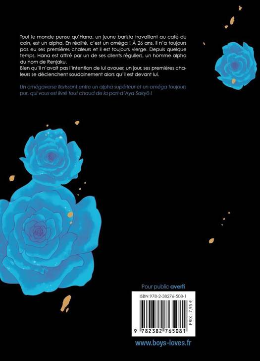 Tout le monde pense qu'Hana, un jeune barista travaillant au café du coin, est un alpha. En réalité, c'est un oméga ! A 26 ans, il n'a toujours pas eu ses premières chaleurs et il est toujours vierge. Depuis quelques temps, Hana est attiré par un de ses clients réguliers, un homme alpha du nom de Renjaku. Bien qu'il n'avait pas l'intention de lui avouer un jour, ses chaleurs se déclenchent soudainement alors qu'il est devant lui. - Un omégaverse florissant entre un alpha supérieur et un oméga toujours pur, qui vous est livré tout chaud de la part de Aya Sakyo !