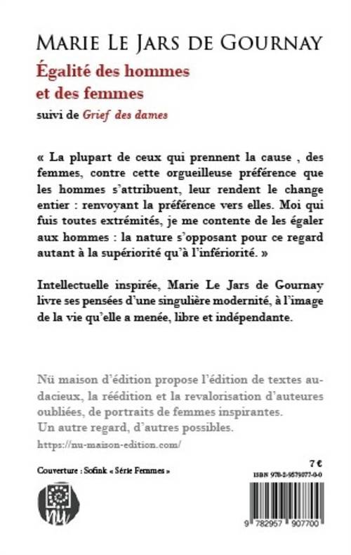 Philosophe humaniste influencée par Montaigne, Marie de Gournay plaide pour l’accès des femmes à l’instruction et à la reconnaissance de leur raison et de leur esprit, au même titre que les hommes. Son style argumentatif est teinté d’ironie envers les idées dominantes de son temps. Ce texte est un des premiers manifestes féministes en langue française.
