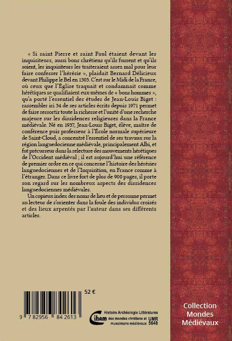 « Si saint Pierre et saint Paul étaient devant les inquisiteurs, aussi bons chrétiens qu’ils fussent et qu’ils soient, les inquisiteurs les traiteraient assez mal pour leur faire confesser l’hérésie », plaidait Bernard Délicieux devant Philippe le Bel en 1303. C’est sur le Midi de la France, où ceux que l’Église traquait et condamnait comme hérétiques se qualifiaient eux-mêmes de « bons hommes », qu’a porté l’essentiel des études de Jean-Louis Biget : rassembler ici trente-quatre de ses articles écrits depuis 1971 permet de faire ressortir toute la richesse et l’unité d’une recherche majeure sur les dissidences religieuses dans la France médiévale. J.-L. Biget a concentré l’essentiel de ses travaux sur la région languedocienne médiévale, principalement Albi, et fut précurseur dans la relecture des mouvements hérétiques de l’Occident médiéval.