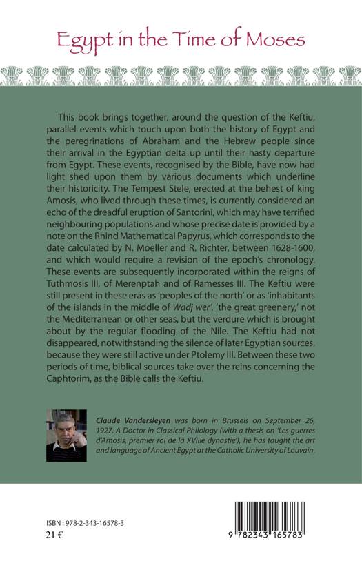 This book brings together, around the question of the Keftiu, parallel events which touch upon both the history of Egypt and the peregrinations of Abraham and the Hebrew people since their arrival in the Egyptian delta up until their hasty departure from Egypt. These events, recognised by the Bible, have now had light shed upon them by various documents which underline their historicity. The Tempest Stele, erected at the behest of king Amosis, who lived through these times, is currently considered an echo of the dreadful eruption of Santorini, which may have terrified neighbouring populations and whose precise date is provided by a note on the Rhind Mathematical Papyrus, which corresponds to the date calculated by N. Moeller and R. Richter, between 1628-1600, and which would require a revision of the epoch's chronology. These events are subsequently incorporated within the reigns of Tuthmosis III, of Merenptah and of Ramesses III. The Keftiu were still present in these eras as « peoples of the north » or as « inhabitants of the islands in the middle of Wadj wer », « the great greenery », not the Mediterranean or other seas, but the verdure which is brought about by the regular flooding of the Nile. The Keftiu had not disappeared, notwithstanding the silence of later Egyptian sources, because they were still active under Ptolemy III. Between these two periods of time, biblical sources take over the reins concerning the Caphtorim, as the Bible calls the Keftiu.