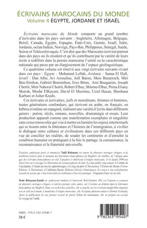 Poursuivant les recherches sur les écrivains marocains de la diaspora, ce volume 4 est réservé aux vingt écrivains suivants vivant dans ces trois pays : Égypte : Mohamed Leftah ; Jordanie : Sanaa El Hafi ; Israël : Dan Albo, Avi Assouline, Joël Baron, Mois Benarroch, Miri Ben-Simhon, Gabriel Bensimhon, Erez Biton, Ami Bouganim, Joseph Chetrit, Meir Nahorai Chetrit, Robert Elbaz, Shlomo Elbaz, Pnina Eliany Shuruk, Moshé ElKayam, David El Moznino, Uziel Hazan, Shoshana Karbasi et Asher Knafo. La présentation de cette production littéraire fait émerger une identité créatrice en quête de reconnaissance et d'affirmation dans le champ littéraire marocain.